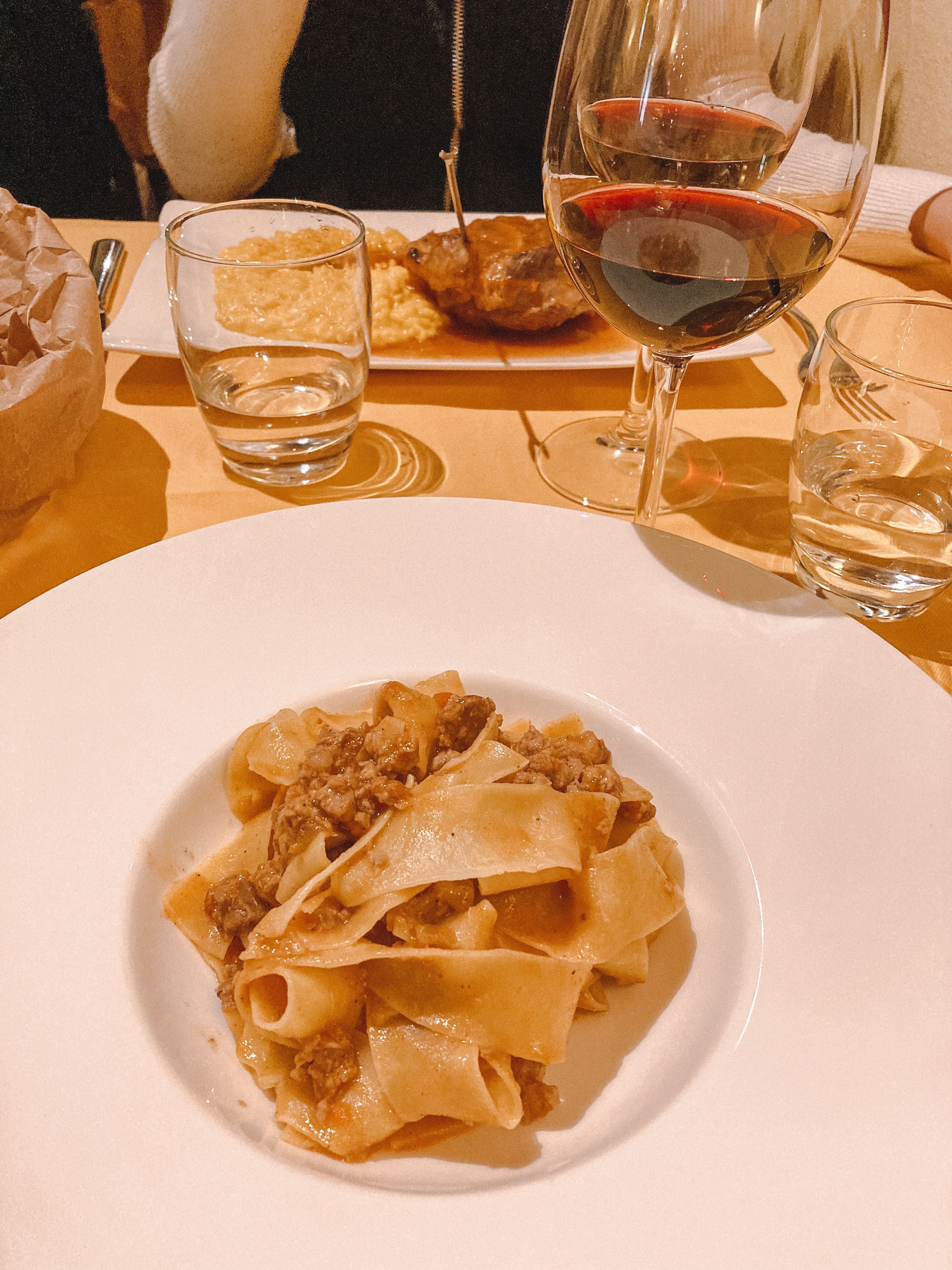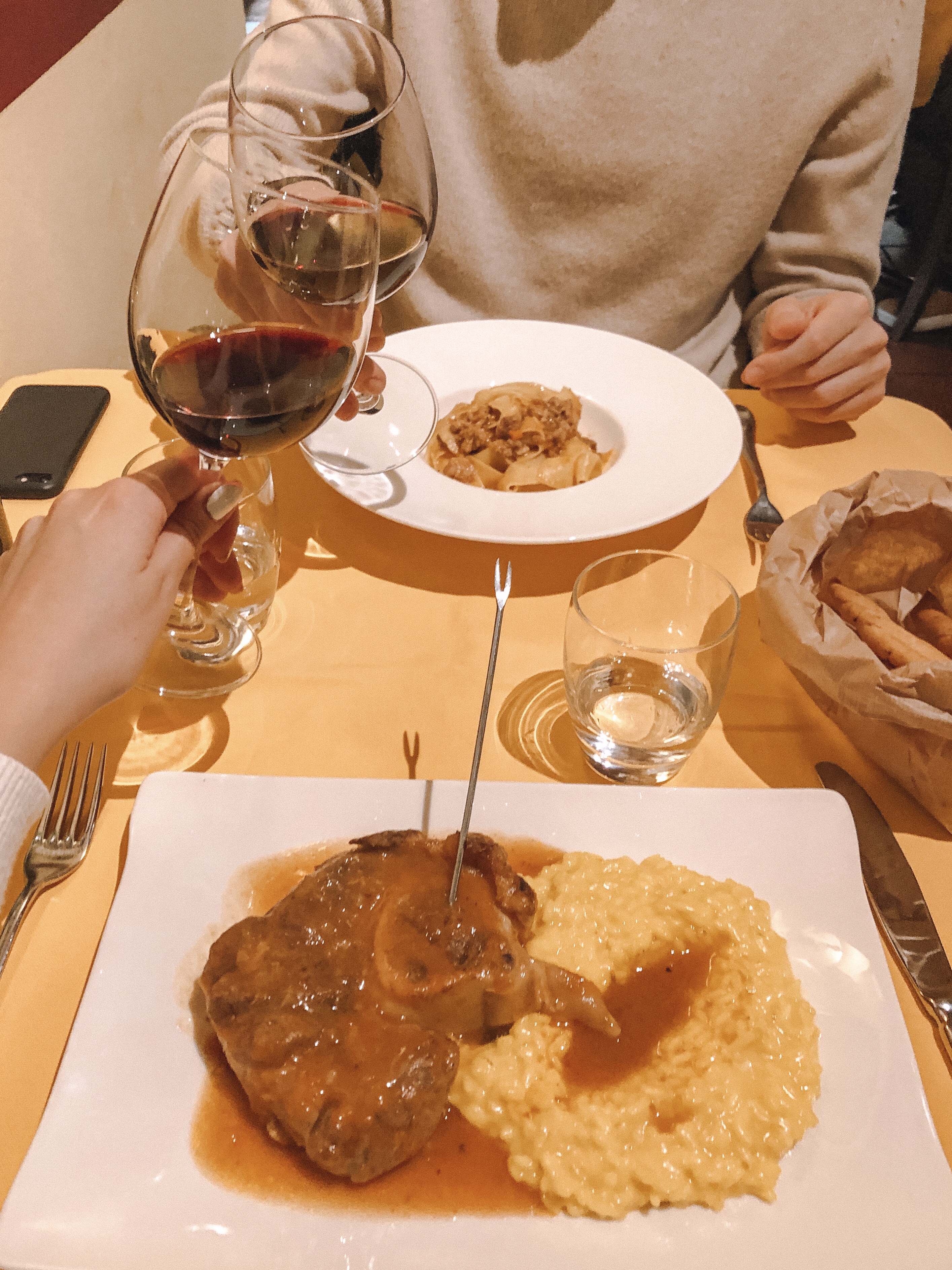 Iniziamo: per antipasto un misto di salumi accompagnati da un ottimo pane. Poi arriviamo alle portate principali: abbiamo preso, da dividere, un piatto di fettuccine con ragù bianco di ossobuco, e poi, non poteva mancare, il piatto unico con risotto alla milanese e ossobuco. Tutto accompagnato da una bottiglia di vino rosso, abbastanza alcolico diciamo (14,5 gradi), ma davvero buono.